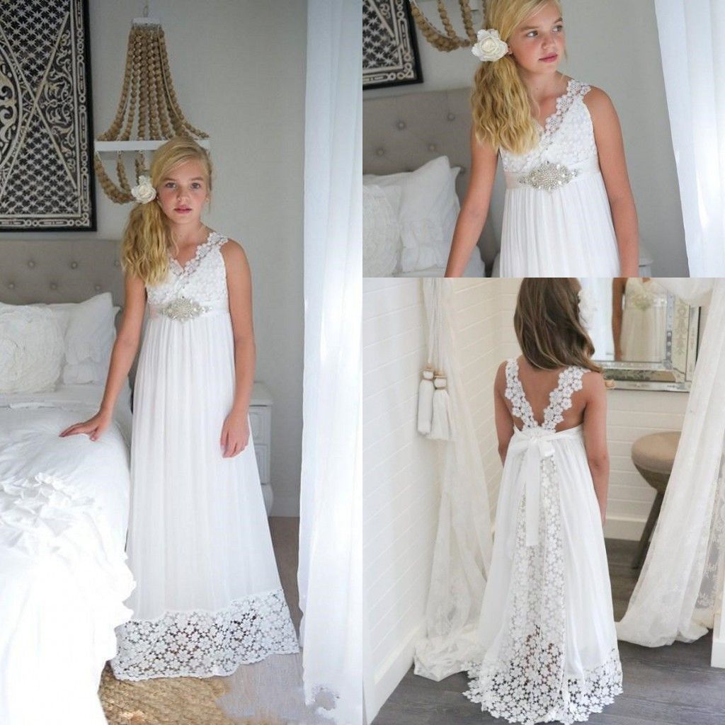 Grosshandel 2018 Reich Einfache V Ausschnitt Spitze Strand Hochzeit Blumenmadchen Kleider Lange Madchen Pageant Kleider Mit Perlen Gurtel Riemen Zuruck