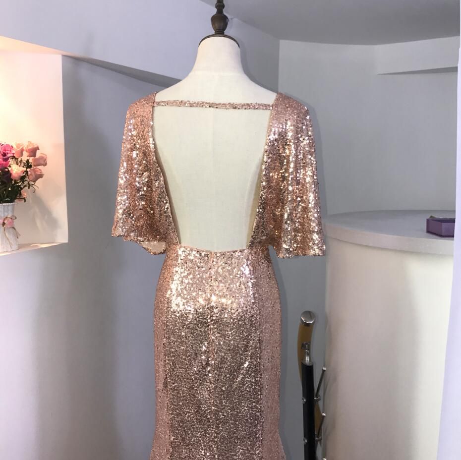 Grosshandel Rose Gold Real Photo Brautjungfer Kleider Tiefem V Ausschnitt Kurzarm Pailletten Hochzeit Gurst Kleider Backless Fancy Jaten Event Kleider