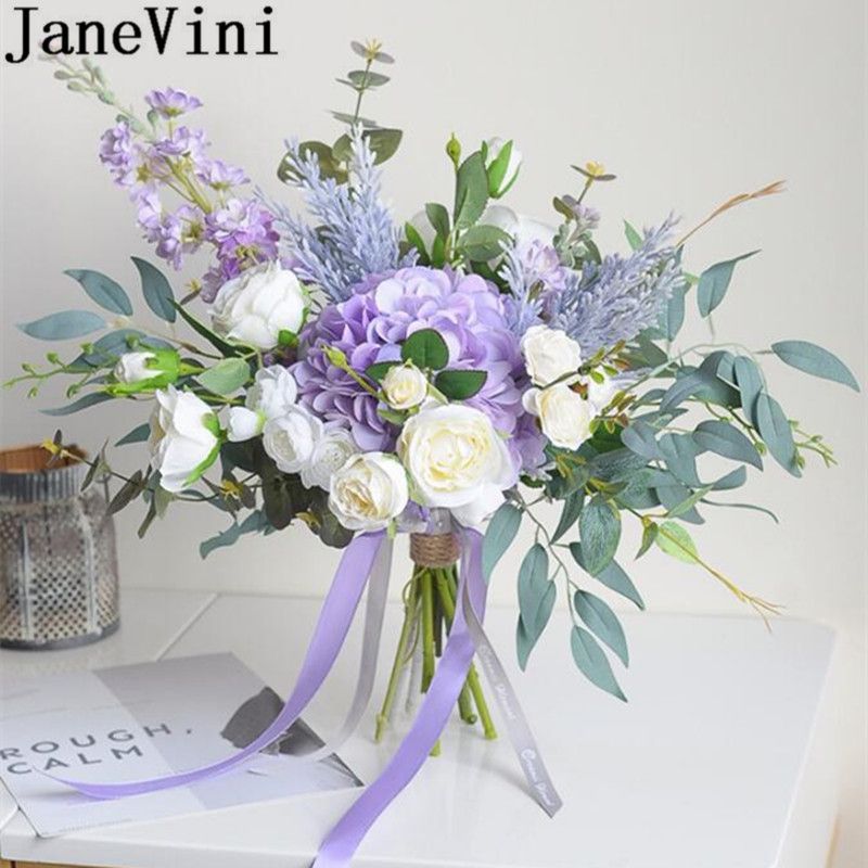 Grosshandel Janevini Lila Blumen Braut Silk Blumenstrauss 2019 Artificial Rose Blaue Braut Blatter Brosche Hand Bouquet Mariage Hochzeit Zubehor Von